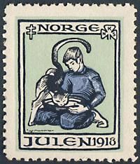 版画タッチの男の子とネコ。クリームグリーンの背景がキレイです。