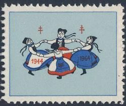 デンマーク・コペンハーゲンの街DJFのクリスマスシールです。落ち着いた水色を背景に、フォークダンスの衣装を着た女の子たちが仲良く踊っています。