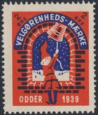 デンマークのローカル、ODDERのクリスマスシール。とんがり帽子の真っ赤な男の子が鐘を鳴らしています。バランスのとれたかわいらしい一枚