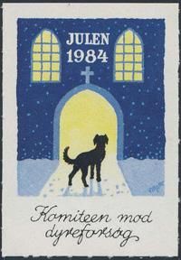 デンマークの動物委員会・KMD発行のクリスマスシール。KMDは動物実験の廃止を訴える”動物愛護”の委員会です。雪の中、一匹の犬が建物の入り口に立っています。