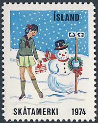 アイスランドのローカル・Spejder-Forbundetのクリスマスシールです。寒そうだけど、ミニスカートの女の子が雪道を歩いています。雪だるまさんにごあいさつ。